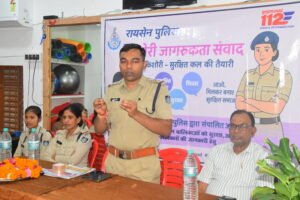 रायसेन पुलिस द्वारा संचालित “किशोरी जागरूकता संवाद” अभियान के तहत रविवार शाम को बरेली नगर के किनगी रोड पर हनुमान मंदिर की पीछे संचालित होने वाली अनन्या महिला योगा क्लास में विशेष कार्यक्रम आयोजित किया गया। जिला पुलिस अधीक्षक पंकज कुमार पांडे के निर्देशन में आयोजित इस कार्यक्रम में थाना प्रभारी कपिल गुप्ता, एएसआई रानी चौहान और कांस्टेबल प्राची ने उपस्थित महिलाओं को कानून, सुरक्षा, साइबर अपराध और आत्मरक्षा और स्वस्थ संबंधित से जुड़ी महत्वपूर्ण जानकारियाँ दीं।